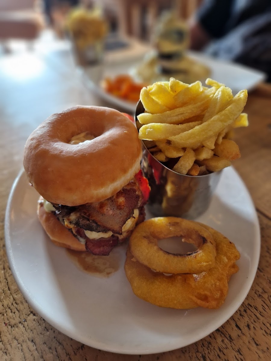 The Sunday Roast is a must-try, served with all the traditional sides that make for a truly satisfying meal. For those craving a more unique combination, the Fish, Chips & Mushy Peas, or the Donut Burger provide a delightful twist on classic comfort food. If you're in the mood for something a little more adventurous, try the Black Pudding and Chicken Stack or the indulgent Pork Stif. Other favorites include the Chicken Balti with Rice, Cumberland Sausage, and the Belgian Waffle-an irresistible treat that adds a sweet touch to your meal. For something a bit lighter, the Large Half Roast Chicken is a popular choice, offering a fulfilling meal with a tender, flavorful chicken.